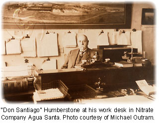 ![]() Oficina Agua Santa, belonging to Messrs. Campbell Outram y Cia. Productive Capacity, 180,000 Spanish quintals per month. Managed by Mr. J. D. Whitelegg, it had at the time 1,000 workers. Photograph from Album Salitreras de Tarapacá of L. Boudat y Cia. Iquique 1889. |