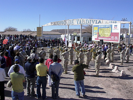 | Desfile de delegaciones y asociaciones de pedrinos y pampinos como colofón del Acto Cívico realizado en la Plaza de Armas de la Oficina Salitrera Pedro de Valdivia, el día domingo 11 de junio de 2006, con motivo de la celebración del 75 Aniversario de su fundación y el 10 Aniversario del cierre de su Campamento, al cual asistieron aproximadamente 4.000 personas. |